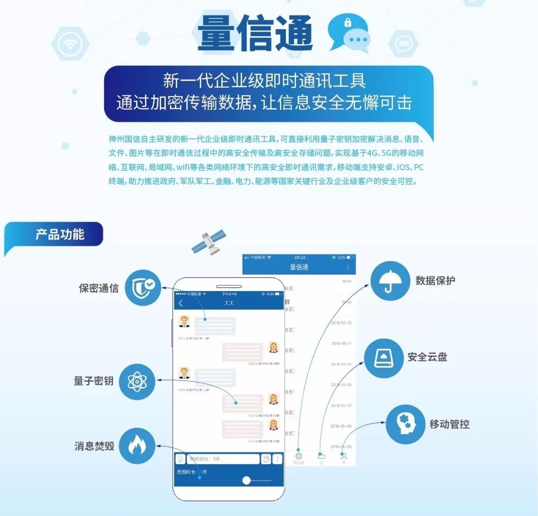 近期,神州信息成员企业神州国信基于金融、政府、军队军工、电力、能源等多个国家关键行业及企业级客户的即时加密通讯需求,自主研发推出新一代企业级即时通讯工具“量信通”,直接利用量子密钥加密解决消息、语音、文件、图片等在即时通信过程中的高安全传输及高安全存储问题。