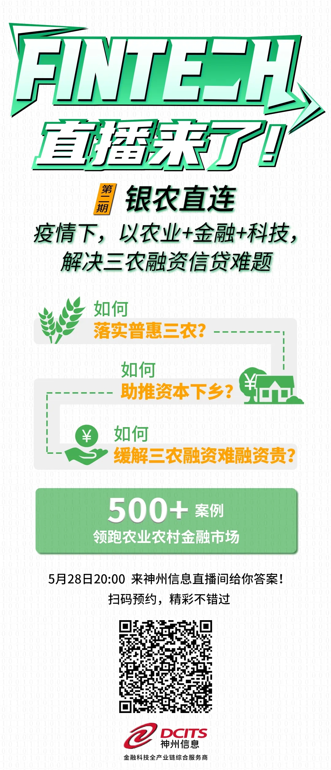 小编说:如果您对“银农直连”感兴趣,如果您来自银行、保险、证券、基金、信托、财务公司等金融机构,或者农业农村等相关部门、机构,请及时扫描二维码或点击“阅读原文”进行报名预约,5月28日20:00不见不散!